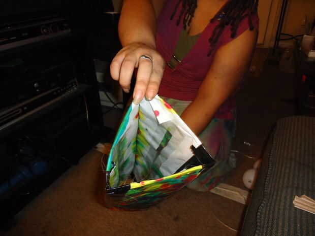 Poner paneles boca abajo sobre la mesa y tome la cinta del conducto y en el panel grande. Voltee y con su cinta de decortive Repita el proceso de plegado la cinta en los bordes superior e inferior. (La siguiente parte es más fácil con un amigo) Cortar dos piezas de cinta. Suave curva del panel en un triángulo y cinta los bordes para mantener en su lugar. Ejecutar un trozo de cinta por fuera para cerrar los paneles.