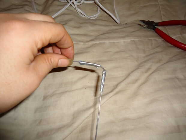 Rasgar o cortar en ocho trozos pequeños de cinta adhesiva. Línea de largo y los lados cortos del alambre para que el doblado pieza alineados y en su lugar con cinta. Debería verse como la mitad de un rectángulo.