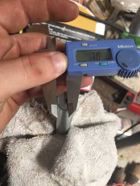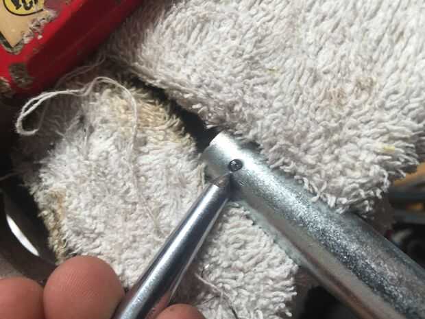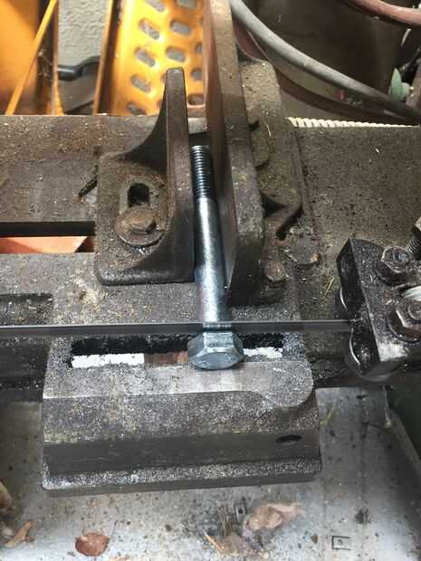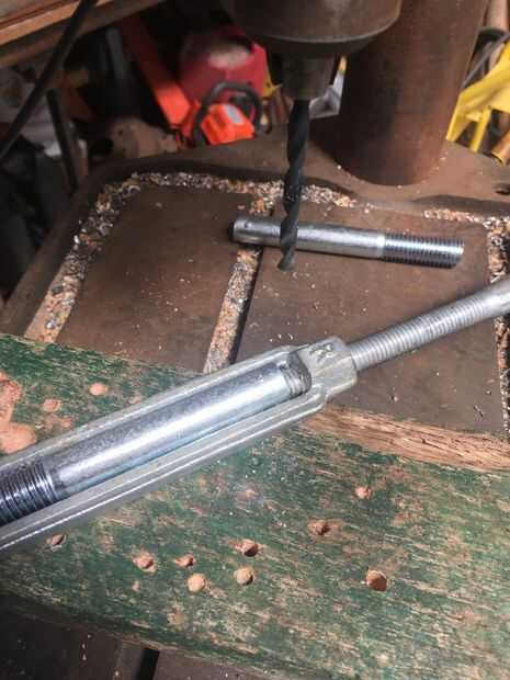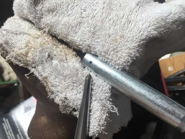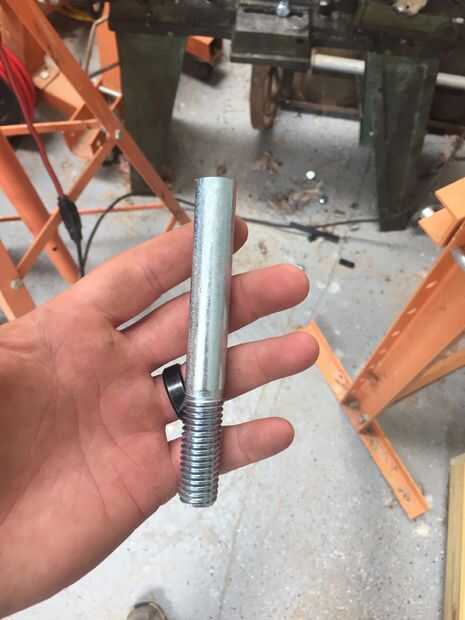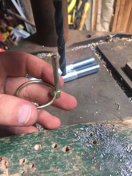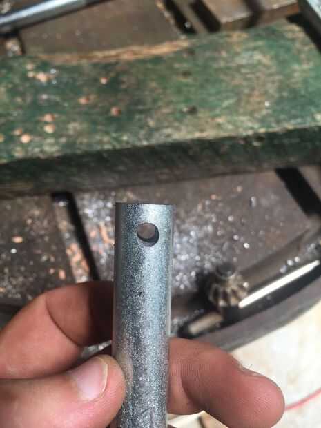 Comience con la cabeza de su tornillo de 5/8 de corte. Luego medir el centro y dibujar una línea abajo. Luego bajan un poco. Opté por 8mm y hacer un punto allí. Aquí es donde vas a perforar el agujero para el pasador ir a través de. Recibir un golpe a ese punto para hacer un comienzo para la broca ir. Asegúrese de que tiene una bastante grande broca para el pin pasar y comenzar su taladro. Tenga en cuenta que es muy difícil de perforar un agujero exactamente directamente a través de su eje recién hecha, pero una vez hecho, repita para el otro eje, luego pasar al paso siguiente.