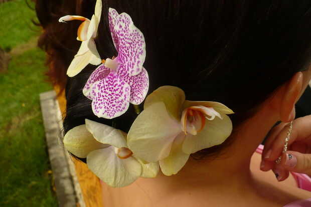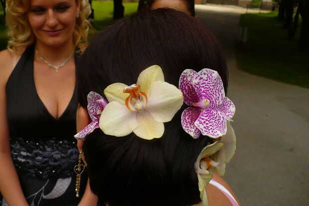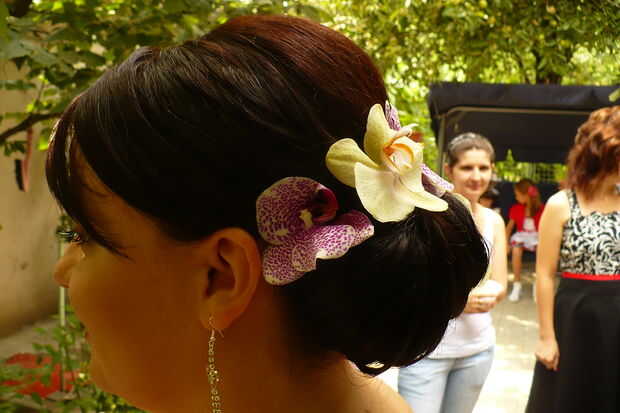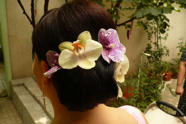 Tenía este peinado en una boda donde yo era madrina. No planeo este hairtyle desde el principio, pero una vez terminada mi estilista dijo que algo faltaba. Por suerte mi estilista vive en el mismo barrio y así llamé a mi marido para traer algunos frome de flor de la orquídea de nuestras plantas. Cambia totalmente el aspecto de mi peinado.
