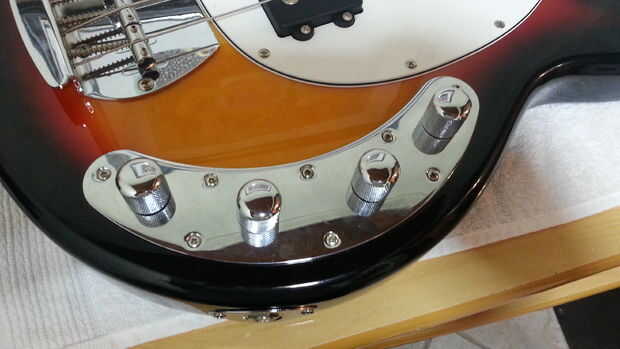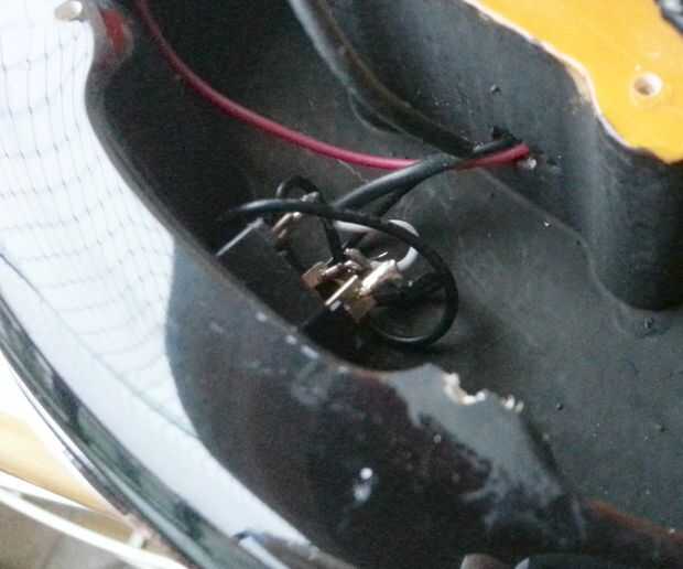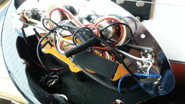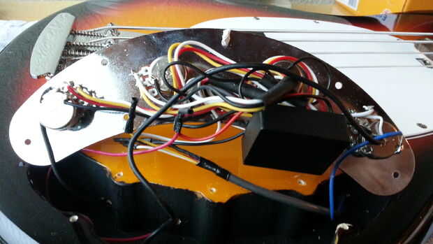 Como he dicho antes, me gusta el aspecto de este bajo--desde el exterior. La segunda foto muestra cómo barato construido es bajo el capó. Lo que es un lío! Los cables eran demasiado largos y también había un par de juntas de soldadura mal. La caja negra sin marca, colgando contiene el trazado de circuito activo y la mayoría de los cables. También se puede ver un primer plano de la toma de salida, con cable de mala calidad y no blindar a todos. Lo único que se puede llamar "blindaje" es la pintura conductora negra (sé que es conductora porque lo he probado con mi multímetro). No es de extrañar que recoge las señales de RF.