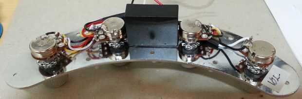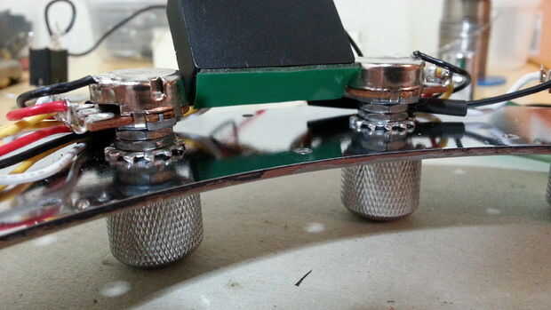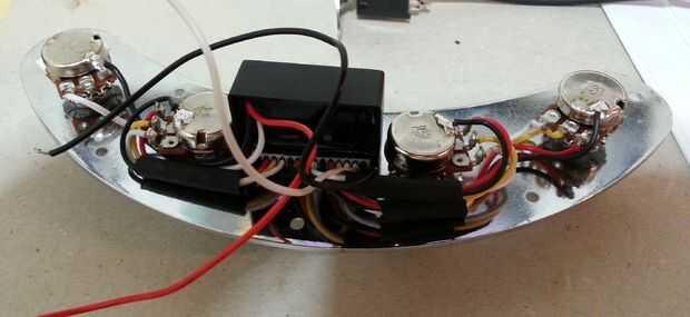 he usado mi teléfono para sacar fotos de todo el cableado y también tomó algunas notas para que no confunda nada. Gira las macetas dos centro un poco para hacer más espacio para la caja negra entre ellas. En la imagen se puede ver justo antes de que pelan la cinta. Ten cuidado ya que algunas cintas hará que un vínculo muy fuerte con la placa cromada. Sé esto porque en mi primer intento me fijo en la placa en lugar de longitudinalmente. Esto era estúpido porque la Asamblea no encajaba en el compartimiento de bajo!