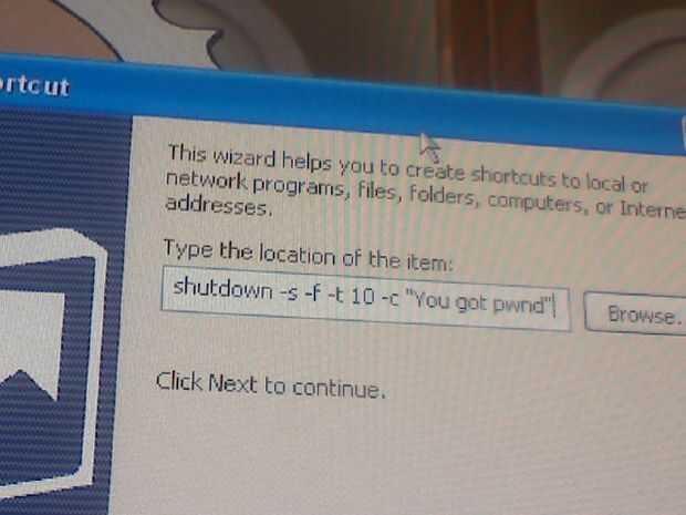Shutdown -s -f -t 10 - c "Tenes pwnd"