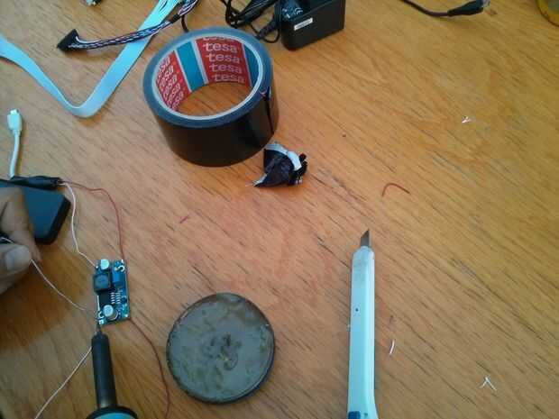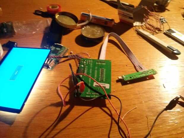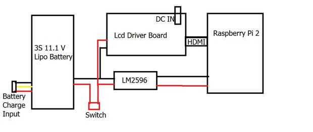 Antes de comenzar la Asamblea. Construyo el circuito y probarlo. Después de que se han intentado diferentes versiones, finalmente se alcanzó el prototipo de trabajo. Este es el esquema del circuito. Básicamente, pantalla LCD funciona con 12 voltios y la frambuesa Pi 2 trabaja con 5 voltios. Por lo tanto, el circuito necesita un regulador. Hay un interruptor para cortar la energía de la batería. Cuando se carga de la batería, la batería debe apagar y el circuito puede usarse con DC en el conector de la tarjeta de conductor del LCD. Es una buena solución para veces batería.