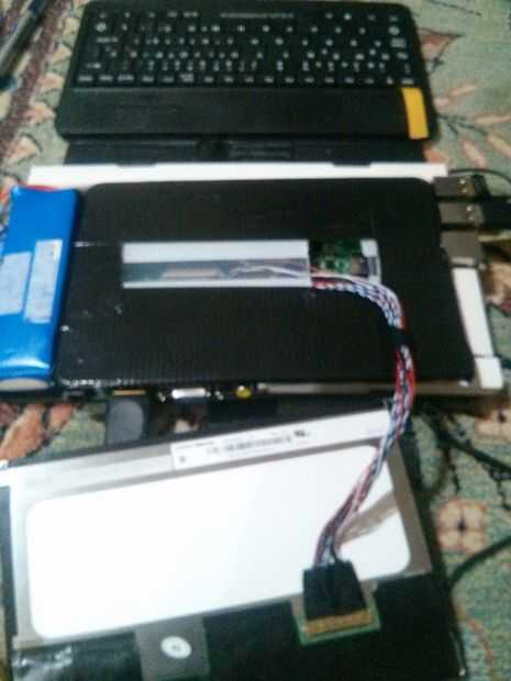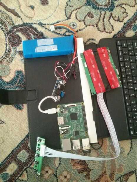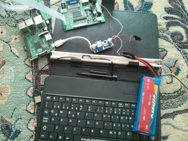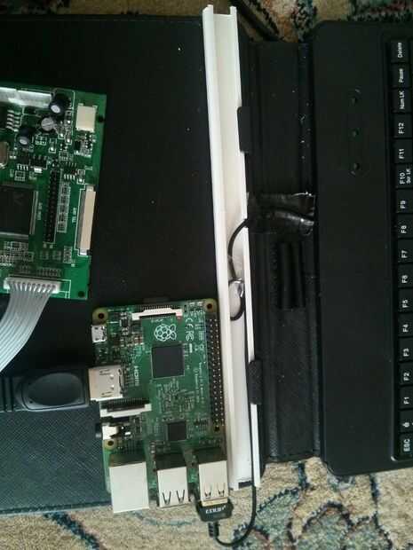 Frambuesa Pi 2, tablero de conductor del LCD lipo batería y se monta. Un trozo de cubierta del cable se coloca boton lateral de la caja. De esta manera, cable del teclado se queda en la cubierta del cable.