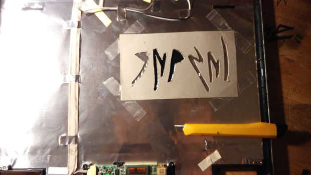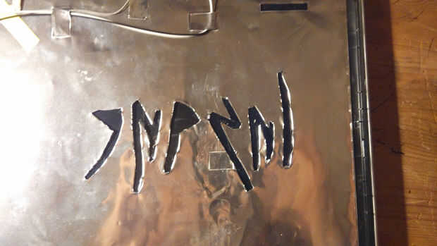 hice una plantilla con mi inscripción y adjunta a la hoja en el reverso de la contraportada para transferirlo a la lámina. Después de eso corté las letras en el papel.
