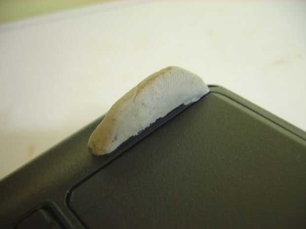 Otro arreglo hice hace unos pocos meses fue resaltar la altura de los soportes traseros de la notebook. Retiré unos pequeños tacos de goma autoadhesivos había, y en sus lugares coloqué un trozo de masilla epoxi de aproximadamente 1 cm de altura. Esto me da más margen para el travesaño central de alambres enganche bien en su lugar, pecado riesgo de la notebook se zafe y caiga.