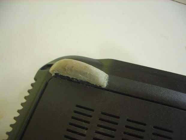 Otra reparación que hice hace unos meses era elevar la altura de los soportes posteriores de la notebook. Quité algunas almohadillas de goma autoadhesivas que habían, y en su lugar puse un pedazo de masilla de epoxi de 1 cm de altura. Esto me da más margen para el pestillo de la barra transversal de cables central firmemente en su lugar sin riesgo de que el cuaderno a ser flojo y caer.