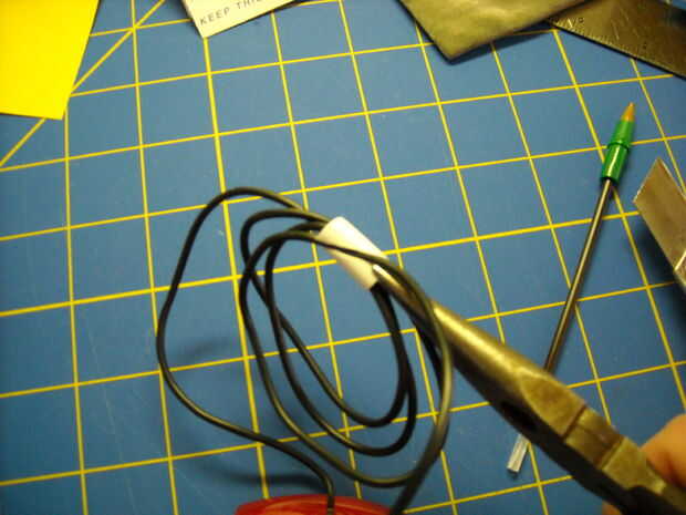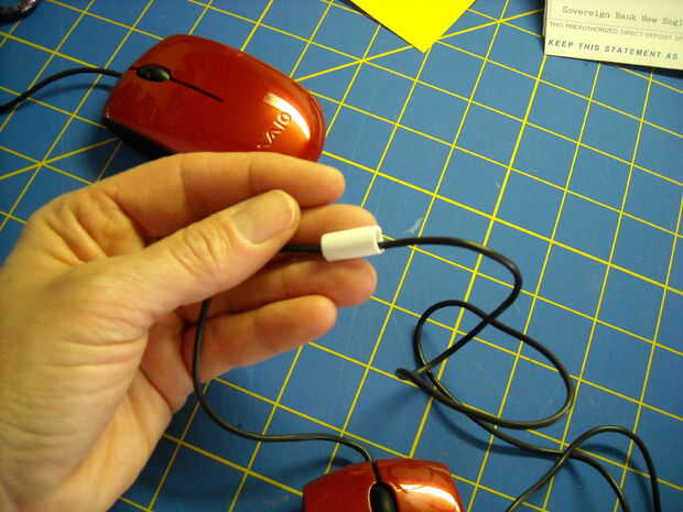 Tirando y estirando la ranura diagonal, inserte el lazo de una cuerda a la vez. He encontrado que con mi mouse y el diámetro del cable, bucles de 4 es perfecto. El cable es lo suficientemente suelto para volver a ajustar el tamaño de los lazos aunque apriete lo suficiente para mantener los lazos en el lugar.