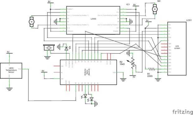 Esta una nueva adición al robot que muestra la temperatura y la distancia. Conectar según el texto de abajo. He añadido un interruptor para la luz de fondo.