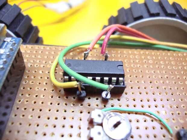Conecte el positivo del motor adecuado al pin 3 y negativo al pin 6. Conecte el positivo del motor izquierdo al pin 11 y negativo al pin 14. Asegúrese de que se conectan de la manera correcta.