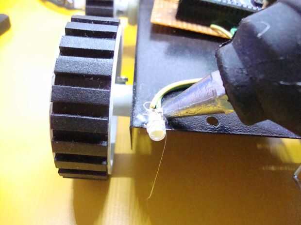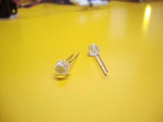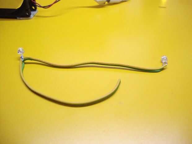 Conecte dos LEDs blancos en paralelo y la soldadura de dos cables, el positivo uno conectado al Arduino pin A3 y el negativo conectado a GND de Arduino. fijarlo usando gule caliente.