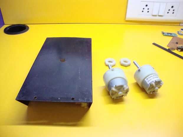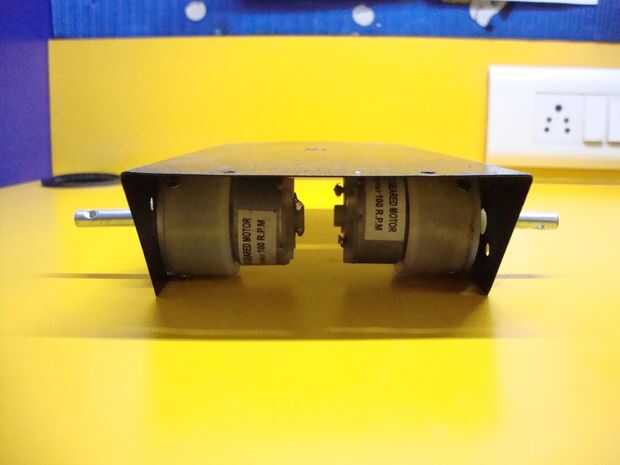 Empezar montando los motores en el chasis como se muestra en la imagen de arriba. Puede utilizar cualquier tipo de base como aluminio, madera, plástico o usted podría incluso hacer su propio. Utilice abrazaderas para montar los motores si no usas un tipo similar de base.