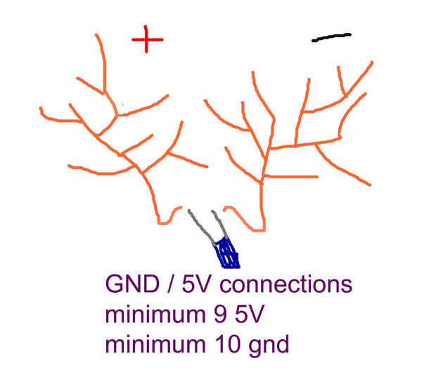 dependiendo de cuantos pines de 5V y gnd-pins 3v-pins que desee en su acabado "arduino" puede hacer más armas en estos. en este proyecto hice solamente un 3Vpin para la soldadura de cobreAlambre para 3V es sólo un triple normal pero si quieres 3V-pins más usted puede hacer que se parecen más a los otros en la otra foto. 5V tiene más armas desde el chip y los diferentes componentes y partes tiene que estar conectado a 5V. Con esto muchos brazos allí será sólo uno o dos GND/5V patillas.
