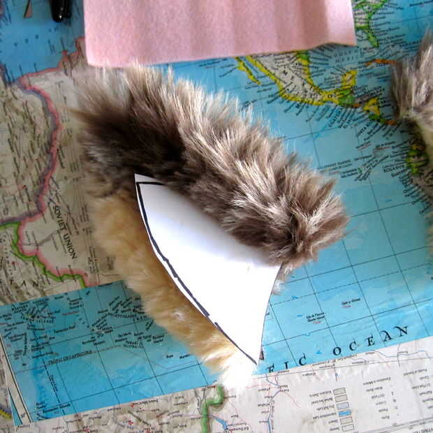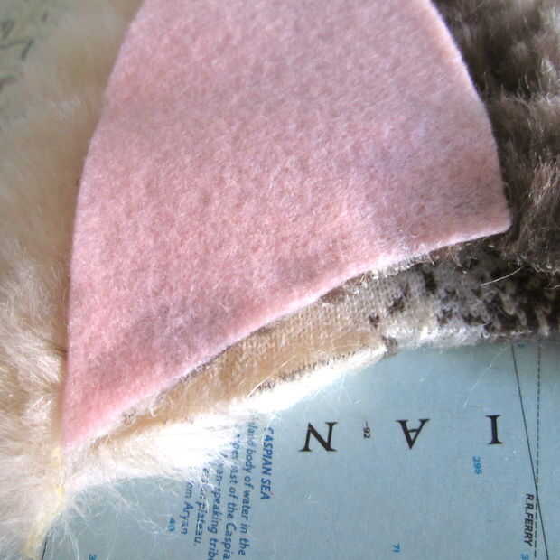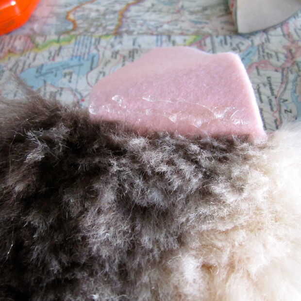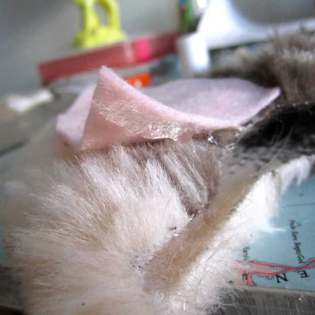 Desde el borde inferior de la oreja y caliente pegamento del borde inferior del fieltro que poco a poco. Luego plegar el fieltro y añadir otra línea de pegamento, pulsa en el fieltro, dejó seco y repetición. Seguir doblando y pegando hasta que se une a la piel. Haciendo un poco a la vez le ayuda a evitar las arrugas y conseguir el fieltro en el lugar correcto. : D