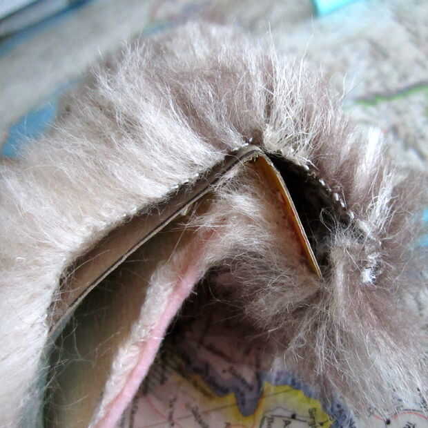 Estirar la piel sobre el cartón y pegar los bordes en su lugar. Recorte cualquier cartulina que sobresale demasiado. Pegué por la parte delantera de la oreja primero, y luego el borde doblado y luego la parte de atrás. Estire la parte posterior para que la piel llega a la parte delantera de la parte inferior de la oreja para que no tenga ningún cartón colgando hacia fuera. :)