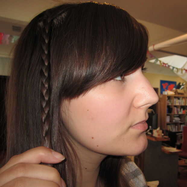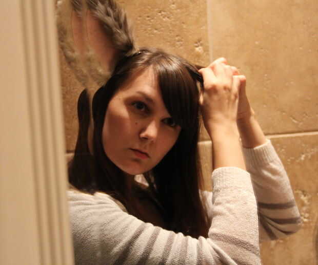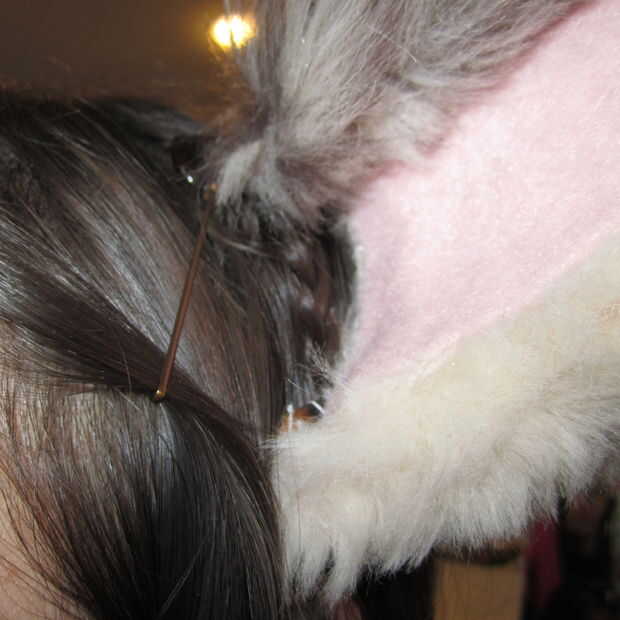 Hacer una trenza pequeña (1/2 pulgada o menos ancho) desde la parte superior de la cabeza debajo de la oreja sobre la oreja. Puede anclar las orejas de piel sintética en las trenzas! No tienes que asegurar la trenza o trenza por el pelo, tampoco. Es bastante invisible. He incluido fotos para mostrar cómo lo hice. Las orejas sobrevivieron a subir y bajar escaleras, subir y bajar la calle y el viento de San Francisco!