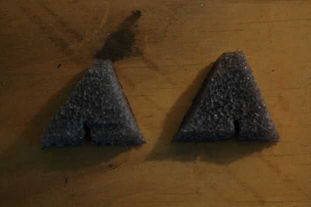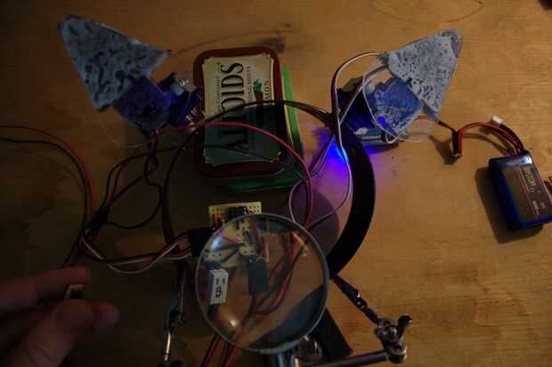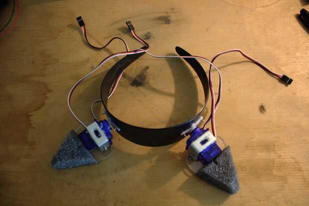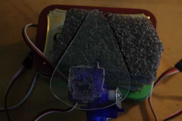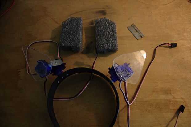 Primero cortar el canto una pequeña en la parte inferior para que encaje perfectamente en la parte superior del servo superior (detrás del acrílico por supuesto). Una vez que has posicionado, trazar el borde de la oreja acrílico sobre la espuma y corte el sobrante. Cortar la espuma en exceso a la parte superior de la oreja un poco de forma. No te preocupes demasiado por esto ya va a quedar oculto por los pliegues de la piel del paño.