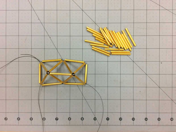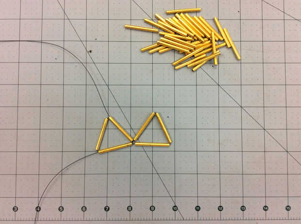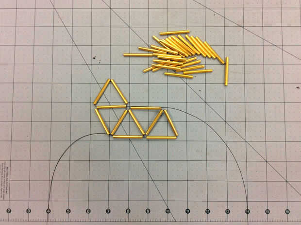 Empieza por tomar un trozo largo de alambre rebordear (aproximadamente 6 pies) y empezar a encadenar tres pedazos de tubería para formar un triángulo. Para asegurar la forma del triángulo, tire del cable a través de uno de los lados y apretar. A continuación, tome otro tres pedazos de tubo y repetir el proceso.