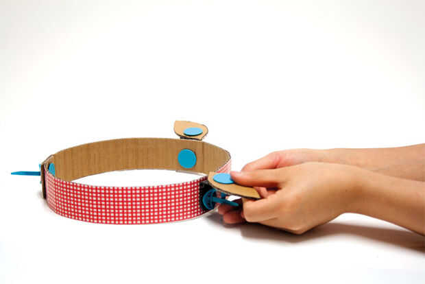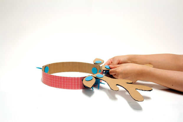 Para conectar las orejas a la diadema, utilice una bisagra de Makedo cerradura colocada en un ángulo recto y conecte las orejas con Makedo de nuevo los clips como se muestra en la imagen.