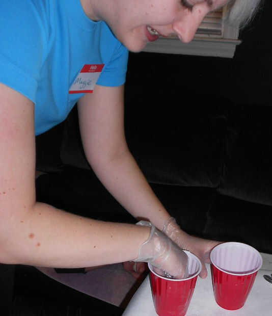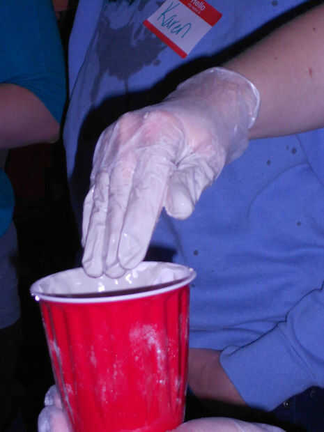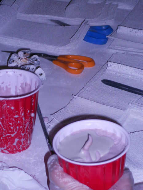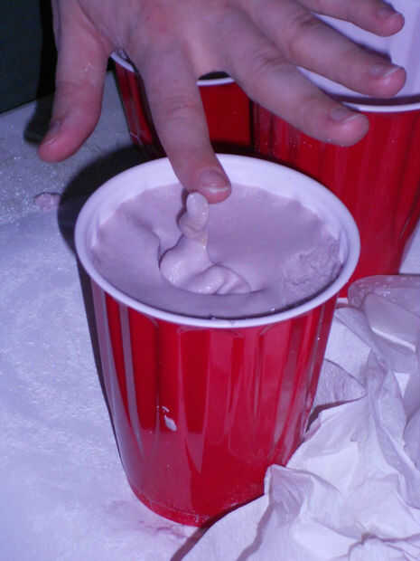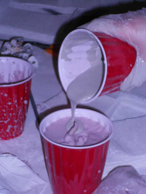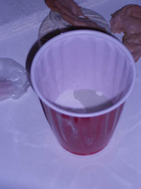 Bien, ahora que tienes el molde de la oreja, coloque en la Copa que utilizó originalmente. Poner en un nuevo par de guantes. Tomar dos tazas de otros como si lo hizo para el alginato y pone agua caliente en uno y ultra cal en el otro. Vierta el Ultra Cal en el agua tibia hasta que "flota" en la parte superior como en la foto. Con los guantes de limpieza nuevos, mezcla los dos y verter sobre el molde de oído. Espere 15-20 min para ajustar.