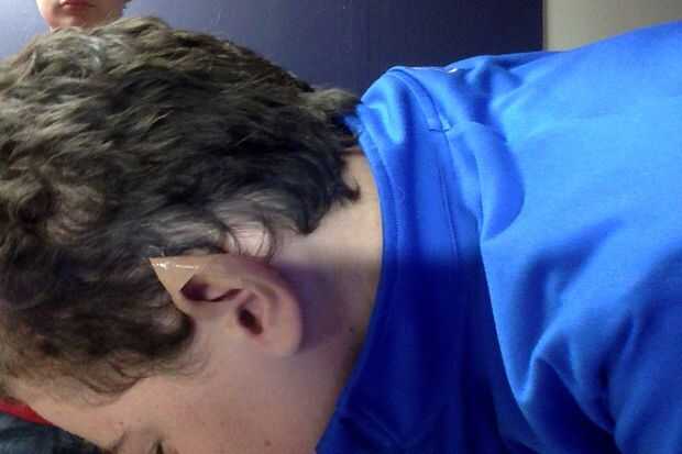 utilizamos cinta médica clara y Fundación para hacer una falsa oreja puntiaguda.Paso 1: cinta Poner capas de cinta médica clara en el oído y recortar hasta un punto.Paso 2: Fundación Pintura Fundación sobre él para hacer la cinta coincida con el colo