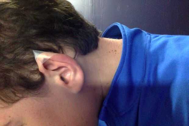 a continuación debe poner cinta en la oreja. Estrellas en la parte superior de la espalda y a continuación, llevar la cinta hacia abajo sobre la oreja. COMO hacen hasta crujir su oído provocando un poco la cinta formar un punto por encima de la oreja. Se trata de su punto.