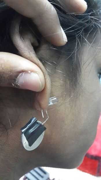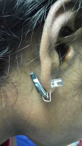 2 ahora Inserte el terminal negativo dentro del agujero en la oreja y doblarla hacia abajo como se muestra en la imagen.