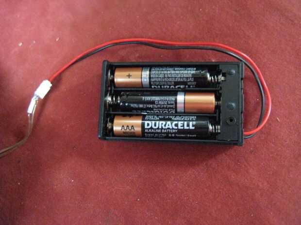 Por lo general, pilas luces de cadena funcionan con 3 pilas AA. La caja de la batería AA es demasiado grande para caber dentro de las orejeras por lo que es necesario reemplazar con una 3 pilas AAA con un interruptor.