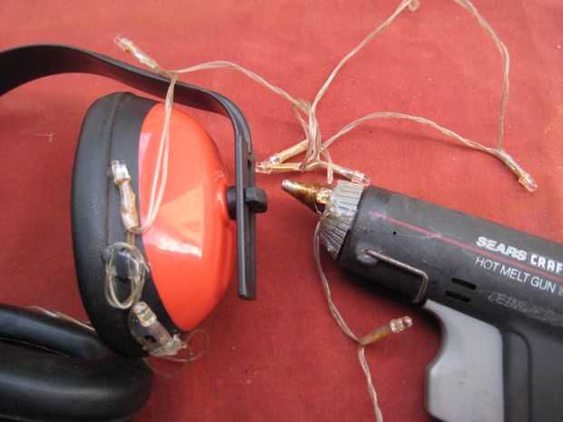 Corté mi cadena de luces que 22 LEDs de funcionamiento. Se disponen alrededor del exterior de una orejera, por la diadema y en la otra orejera. El LED y el exceso de cable se sujetan a las orejeras con una pistola de pegamento caliente.
