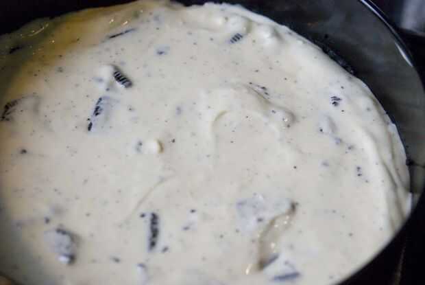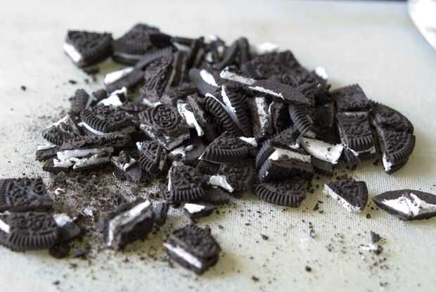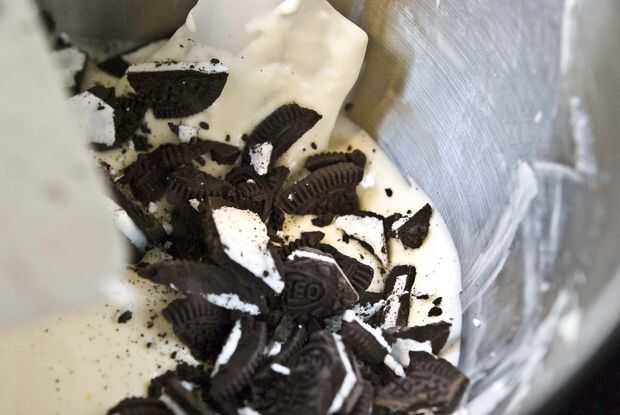 BATIR el queso crema y el azúcar en un tazón grande con batidora eléctrica a velocidad media hasta que estén bien mezclados. agregar los huevos, 1 a la vez, batiendo a velocidad baja después de cada adición hasta que quede mezclado. Agregar crema de leche y la vainilla; mezclar bien. Tomar las oreos restantes y picar para arriba. Agregue suavemente las galletas picadas. Extender masa en corteza preparada.