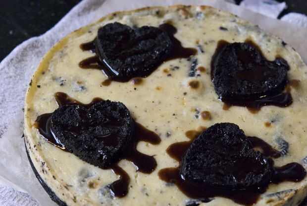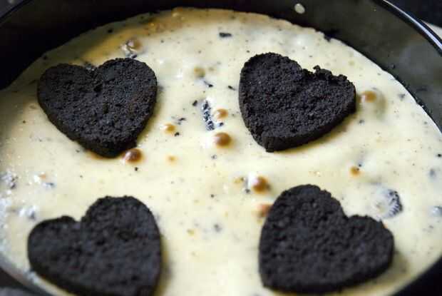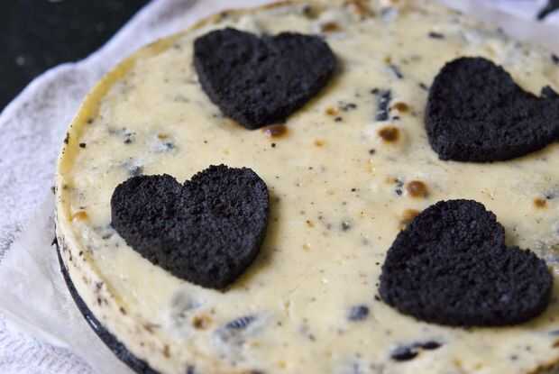 Hornear a 160 C por unos 45, luego retire el cheesecake del horno y poner encima la galletas Oreo en forma de corazón. Seguir horneando durante unos 10 minutos.