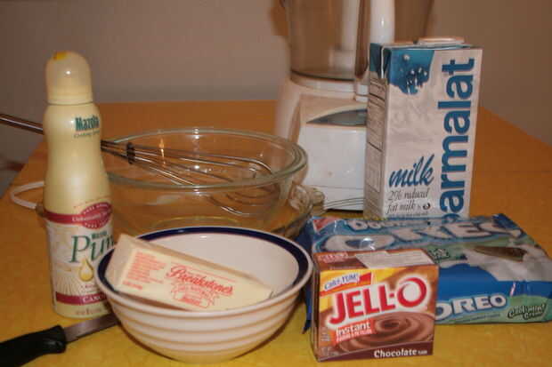 (Ignore el aerosol en la foto; Me di cuenta después de la costra de oreo que tenía suficiente mantequilla en ella ya a engrasar el plato de pastel)