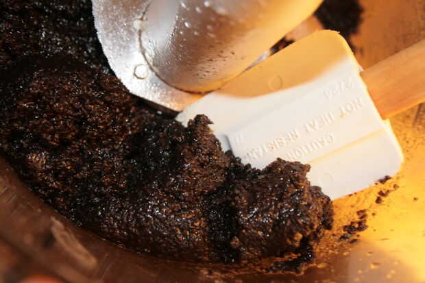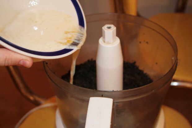Añadir la mantequilla a la galletas Oreo en el procesador de alimentos y procesar hasta que se mezcle. Se verá como la consistencia del cemento mojado.