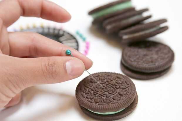 Usando los pernos de la perla, lentamente empuje un perno tiro la galleta Oreo, entrando en un ángulo. Esto puede tomar algo de práctica y se recomienda hacerlo despacio para no romper la galleta. Vamos a utilizar estos para Coloque las galletas en el fieltro sin usar cualquier otro pegamento, así que la galletas Oreo será 100% comestibles!