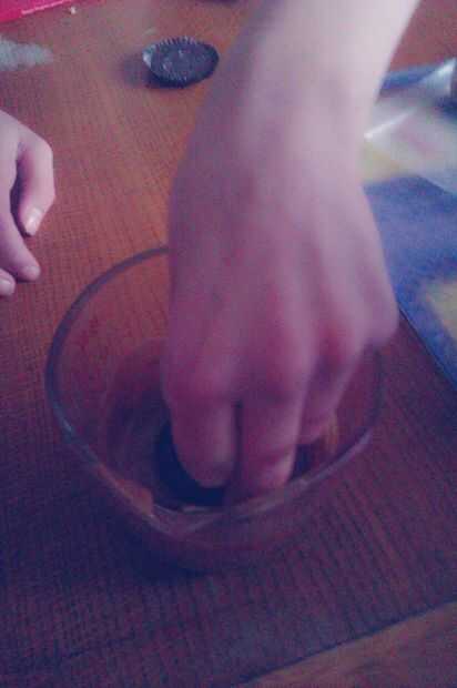 Luego te derrita el chocolate, ya sea por placa o microondas. Esta parte es difícil-usted necesita colocar la 'OreoCup' en el chocolate derretido, asegurando que cubrir todo. -No te preocupes si se cae aparte sólo tiene que colocar nuevamente juntos (: