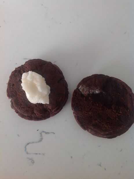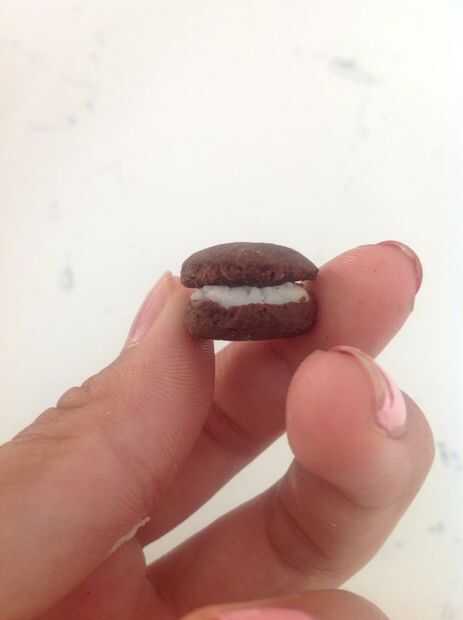 2. Coloque una pequeña gota de escarcha sobre una galleta y presionar a otro en la parte superior para terminar el sándwich de galleta. Puede utilizar una manga pastelera para este paso pero pensé que sería más fácil de usar sólo las manos. Repita este paso con todas las galletas.