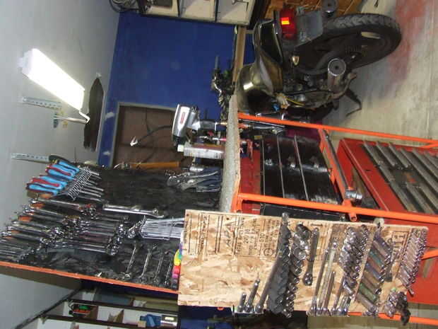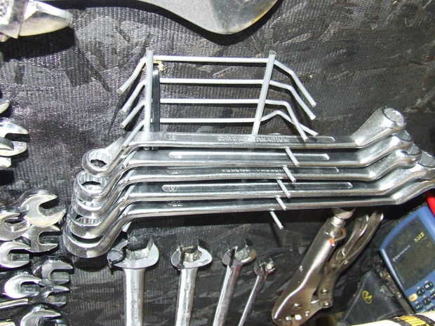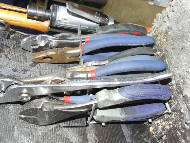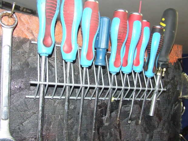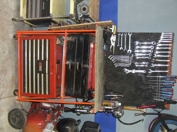 Herramientas necesarias, así que a ser utilizados muy a menudo. Deben ser fácilmente accesibles por lo que yo quería para colgar en una pared, también quería ser capaz de moverse porque necesitan utilizar todo y rodado que fuera también. Un carro. Los carros son caros. Esto es donde se pone difícil, porque utilicé un soldador. Te sugiero que compres uno. Puerto carga las tiene a la venta para como $90. Soldador MIG (muy fácil de usar 110V) no dejes que el sonido de soldador a asustarle. Entonces usé 1/2" Conduit tubería de Home Depot $1,98 por 10 pies. (más barato que 2 X 4) Tomó cerca de 4 polos de 10 pies para hacer este carro. He cortado la parte superior de las cajas de herramientas y había pegado en. Medí el tamaño necesario y comencé cargando con los más necesitadas cosas colgando y con menos frecuencia utiliza herramientas en los cuadros. Tuve Junta chip 4 X 8 $ 7. Taladré agujeros donde quería las herramientas. Pegado en clavos doblados con pegamento para madera para mantenerlo en su lugar.