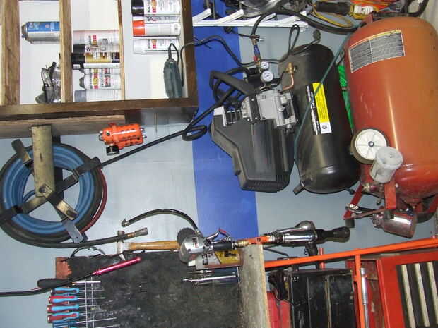 La siguiente cosa que yo sabía que necesitaba con fácil acceso a y la capacidad de moverse era mis herramientas de aire. Así que tiré a la papelera de herramienta de aire. Yo había oído de palas soldadura a una pieza de metal o un enroscarla en un 2 X 4. Yo les había soldada a la parte del carro va hacia arriba y hacia abajo. Me puedo sostener sobre 8 herramientas de aire, que realmente es todo lo que necesitan fácil acceso rápido al resto pueden colgar el compresor de aire baja. Encontrar el Quickcouplers en despacho en harborfreight $0,77 un pedazo que puede conseguir ese acuerdo en ebay a menudo. Asegúrese de que no es el latón los, yo tuve uno pero soldó con autógena en un perno y había atornillado al perno.