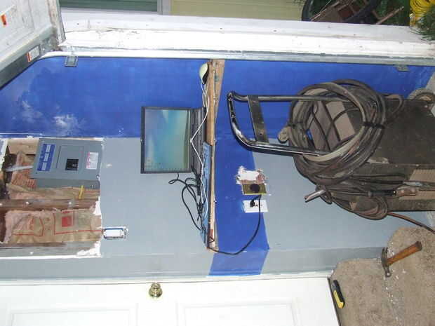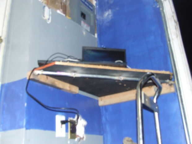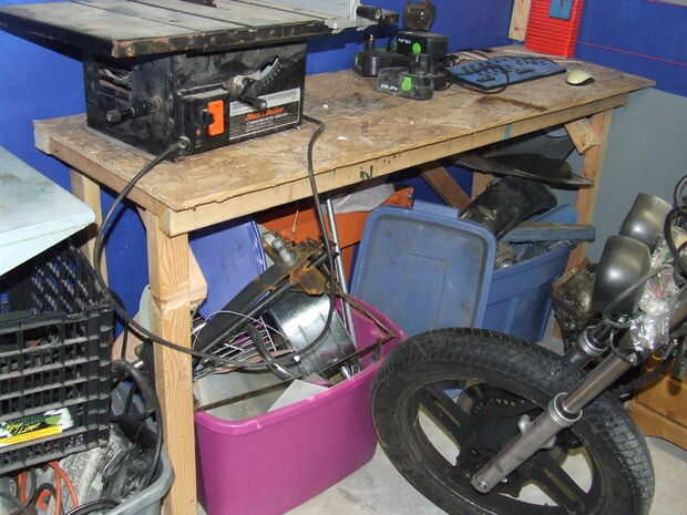 Se puede ver el banco largo que yo también hecho de tablero del 2 X 4 y chip. Fuerte, barato y útil. Cuando tengo más cosas voy a poner cajones en él. Deslice las tinas de plástico llenas de chatarra por debajo. Una vez que el soldador, empezar a mantener cualquier cosa metálica que podría ser utilizado más tarde viene bien.