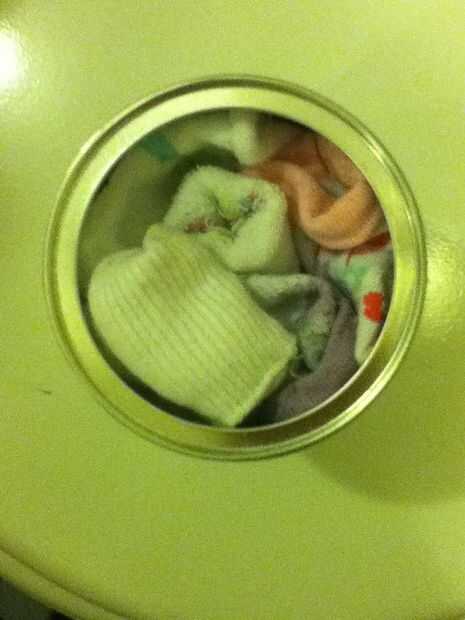 Usar vieja fórmula latas y el bebé puesto calcetines en ellos y binks y, o cucharas de