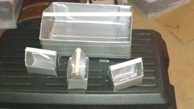 me recordó que ese proyecto en metal tienda hace más de 25 años. En última instancia resultó un poco pesado para marcar y doblar el cartón, pero hice dos de 11 "x 7" y seis de 2 "x 4". Todas las ocho piezas sentó plano y fueron relativamente cuadradas para un proyecto construido con temblorosas manos un par de las asas están un poco torcidas, cuando perforan a través de la cinta el adhesivo tiene un poco pegajoso y colgado para arriba, causando la ficha a deformar... De todos modos, vamos a construir.