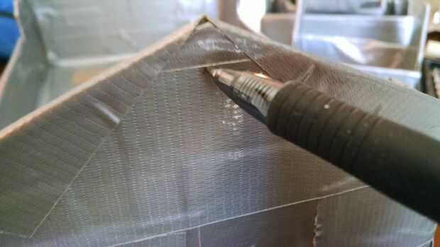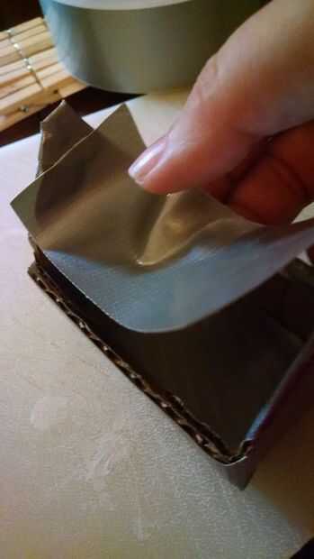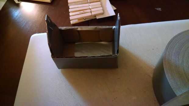 Cuando el pegamento esté seco, quite las abrazaderas y cubierta de la caja de herramientas en la cinta o comuníquese con papel. No es algo obligatorio, pero aumentará considerablemente la integridad estructural de la caja. Cuando su cubierta Corte una clavija de 1/2" a la longitud adecuada y perfore un agujero en el centro de cada extremo. Mida 1/4" hacia abajo desde el punto en cada extremo y luego perforar los agujeros. Recuerda cómodamente pero no lo suficiente como para hacer un agujero en el dct con cinta cardboarduse pequeños tornillos para madera para fijar el mango.