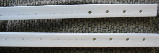 Creo que ahora una pulgada es un poco demasiado espacio. Además, intervalos de 7/8 de pulgada permite 14 agujeros, un número conveniente, mientras que el mío tiene sólo 13.