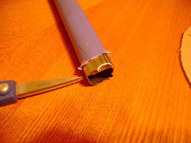 En mi proyecto, he utilizado un plástico cubierto cepillo de tubo de metal hueco. Usé el cepillo específicamente para su gancho en la parte superior, pensando que probablemente puedo esto colgar en algún lugar y hacer que parezca más fresco de lo que realmente es. Simplemente quebró un tamaño decente del cepillo de la escoba y limpiar los bordes afilados con las tijeras. Ahora, porque el modelo de escoba que utiliza, sentí que el plástico en el exterior del tubo del metal podría suponer una amenaza para el pegamento caliente. Tomé las tijeras y cortar una pulgada de plástico del extremo alrededor del tubo.