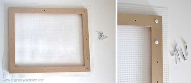 Unir el marco y la tela de malla usando los clavitos de patas largas. Puede obtener en línea en diferentes colores para ir con su marco. Si no quiere usar clavos, puede saltarse hacer agujeros en el marco y simplemente use una pistola de grapas para sujetar la tela de malla en la parte posterior del marco.