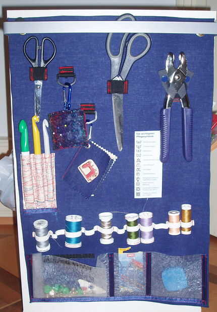 Este es un proyecto de demostración que utiliza un número de técnicas diferentes para organizar los suministros y equipo de costura. Muestra varias maneras diferentes de hacer bolsillos y colgar las ranuras. Un alfiletero con clip y aguja-caso también están incluidos.