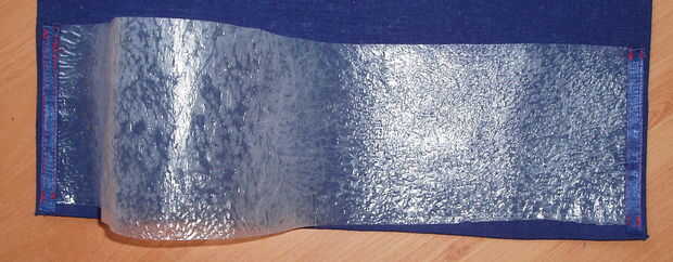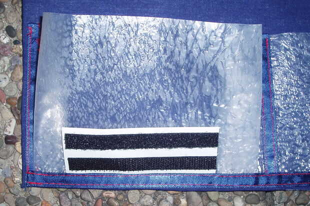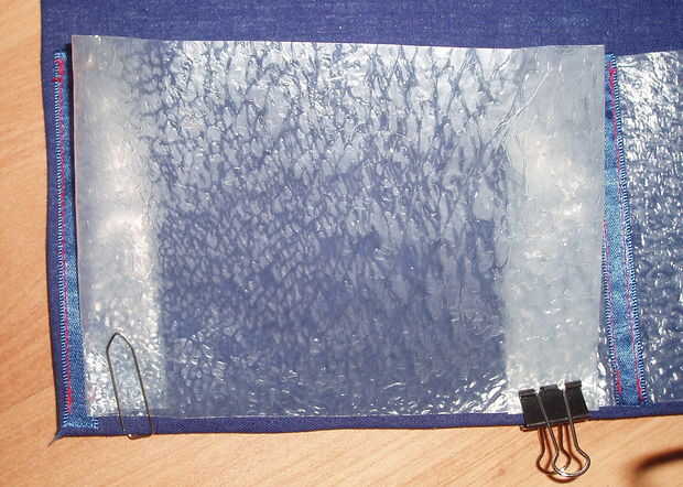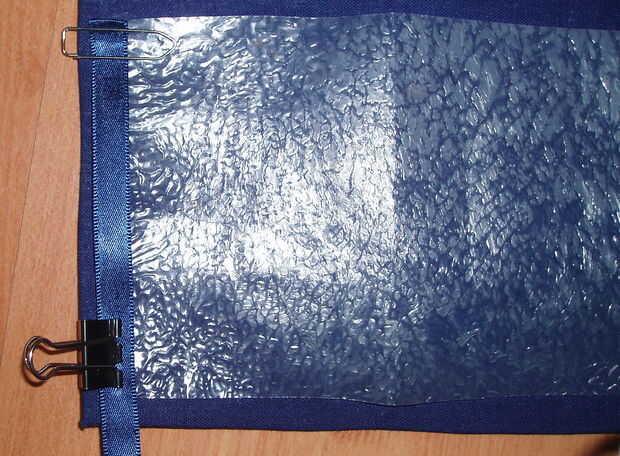 Habiendo conseguido una pieza de plástico perfectamente recortado lo coloque en el fondo de organizador en el lugar elegido o su bolsillo. Para hacer un acabado prolijo Coloque un pedazo de cinta en la parte superior del borde, metiendo la cinta cruda borde en y coser por ambos lados de la cinta. Véase el cuadro 2.