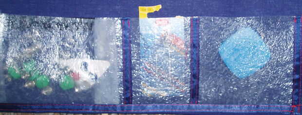 Para crear un bolsillo plano Coloque el plástico sobre la tela. Decidir el ancho de bolsillo que desee. En el ancho elegido coser una longitud de cinta vertical para crear el lado de bolsillo, metiendo en el borde de la cinta en la parte superior. Cuadro 4 muestra cómo 2 plana bolsillos ha sido creado desde el material plástico.
