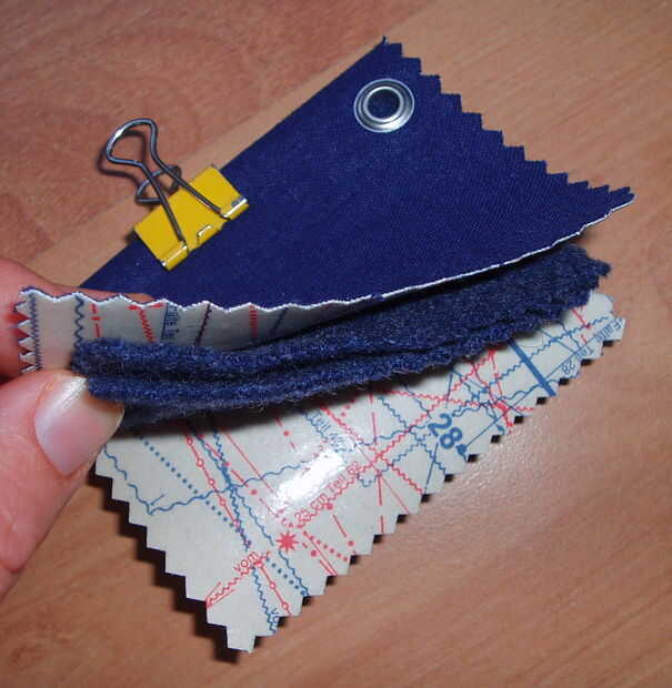 Cortar un trozo de fieltro que es cerca de 2,5 cm (1 pulgada) más pequeño que la tapa. Doble la cubierta y sentir juntos para que queden como un libro - véase el cuadro 2. Asegurar el doblez con el clip y, por fuera, coser unos 2mm (aproximadamente 1/8 de pulgada) de la tapa para que la costura va a través de la cubierta y el fieltro.